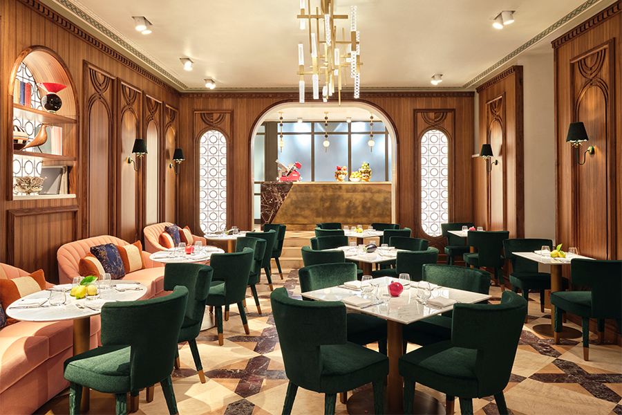 At Giano Restaurant, designed by Meyer Davis and founded by chef Ciccio Sultano, warm wood paneling and emerald velvet chairs set the tone