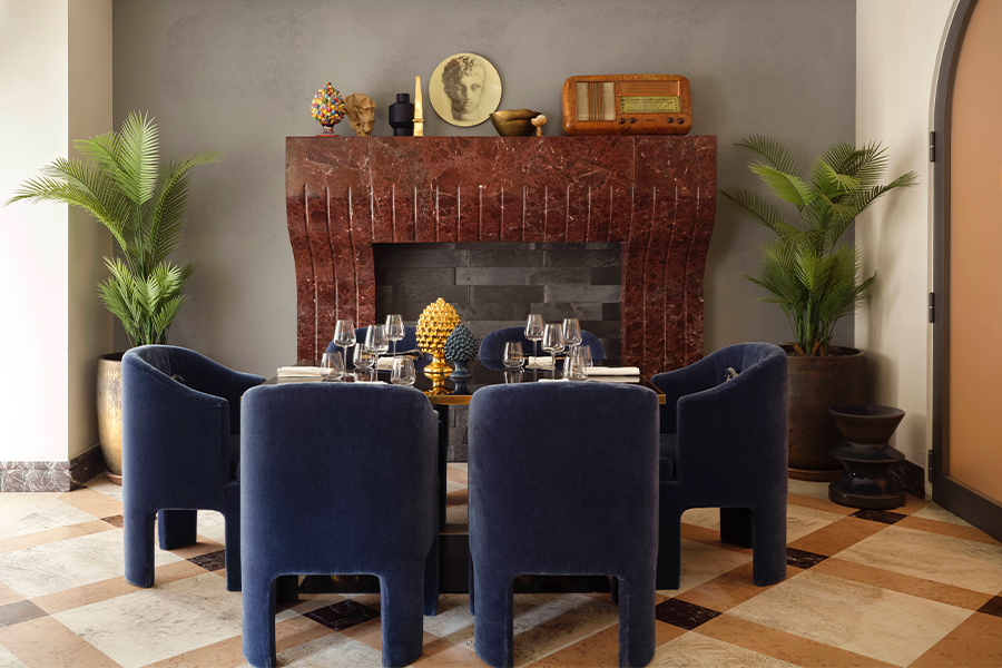 A dramatic oxblood marble fireplace anchors the private dining room at Giano Restaurant
