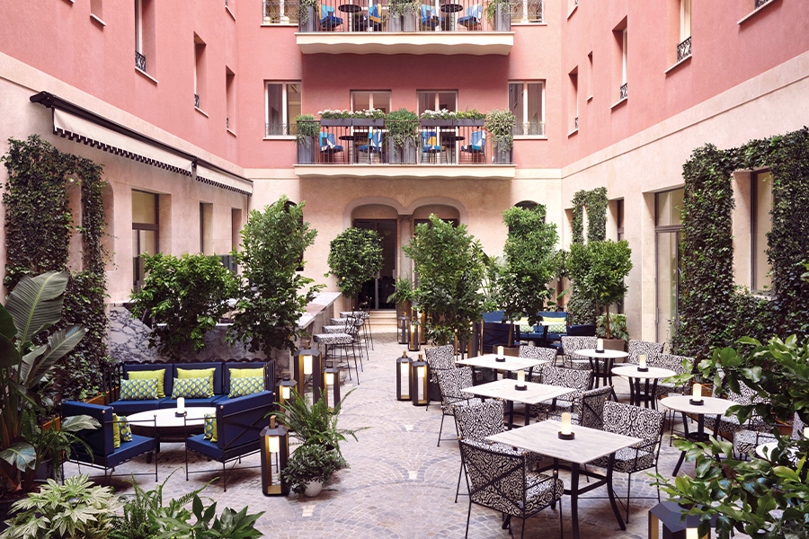 Lush greenery and intimate seating in the W Rome courtyard invite guests to gather