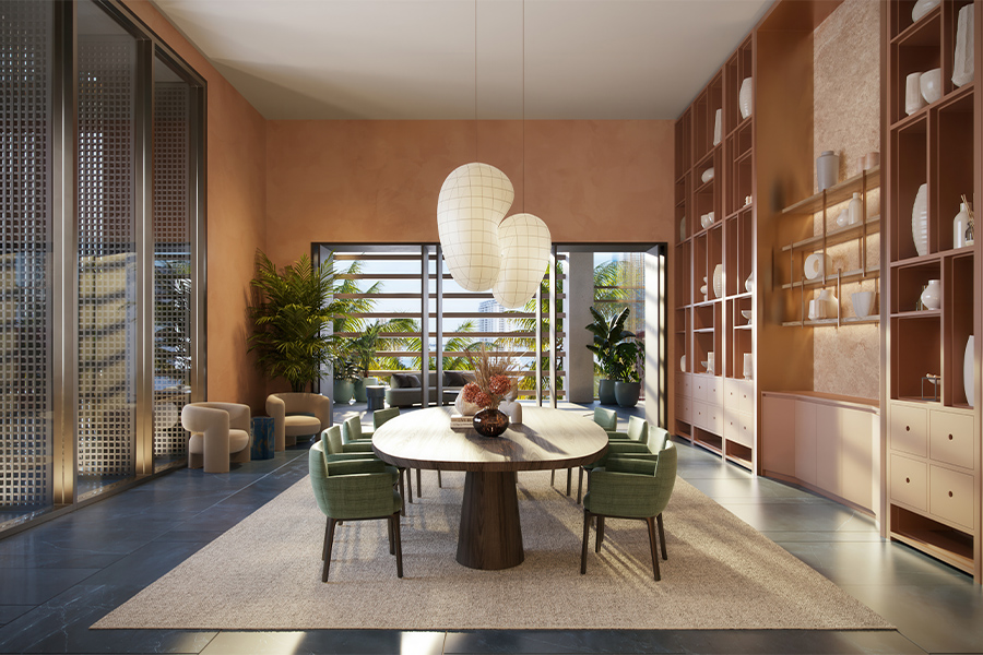 A multifunctional room at the Miami Tropic Residences, shown in a rendering, features a communal table and floor-to-ceiling shelving