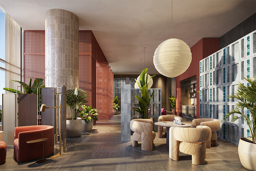 A rendering of the lounge-like coworking space at the Miami Tropic Residences