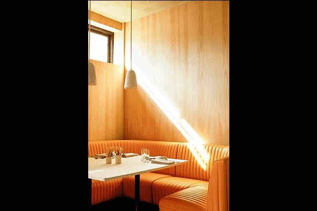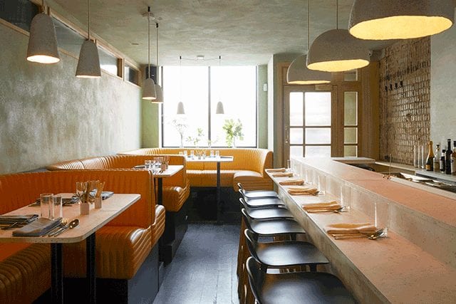 Juliet Walmsley crafted a bright and warm space for Cub, with simple materials, yogurt pot tables, and mustard-colored booths.
