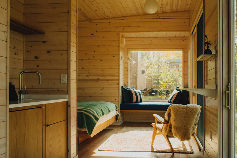 Prospect’s 49 minimalist cabins (designed with Zook Cabins, an Amish builder in Pennsylvania) are clad in cedar, with white pine interiors and expansive windows to keep the outdoors ever-present. “I wanted to make it as quiet as possible,” Carroll says. “I didn’t put much artwork on the walls because I wanted the landscape to be what you’re contemplating.”