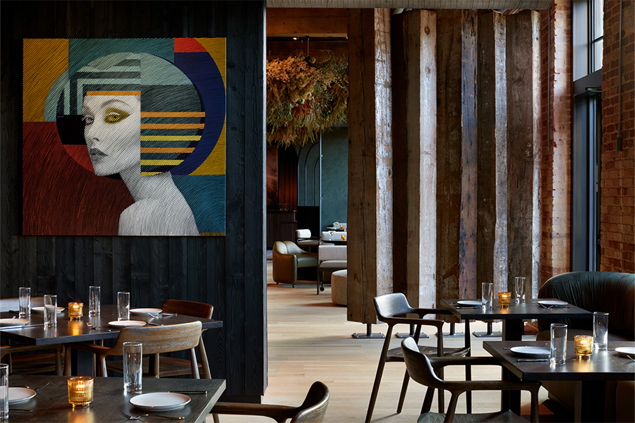 Reclaimed beams form a suspended partition between Rivet House’s restaurant and bar