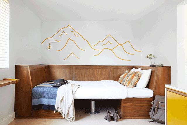 For example, at the Graduate Lincoln in Nebraska, Studio Twist created a faux bois-patterned throw to complement the corn motif on the drapes. Meanwhile, a custom plaid blanket plays off of the signature red headboard wall at the Redbury New York. “Our textiles speak to our client’s brand or sense of place,” she says.