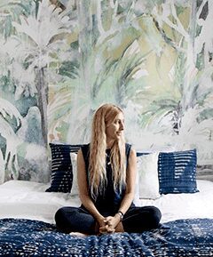 Today, the Brooklyn, New York-based company’s ethereal patterns can be found in hotels like the W Chicago, Mountain Shadows Resort in Paradise Valley, Arizona, and the Four Seasons Resort Maui at Wailea, where the headboards and pillows are upholstered in the company’s fabric. While Campanaro has licensed several patterns from her employees, she still designs most of Eskayel’s collections herself.
