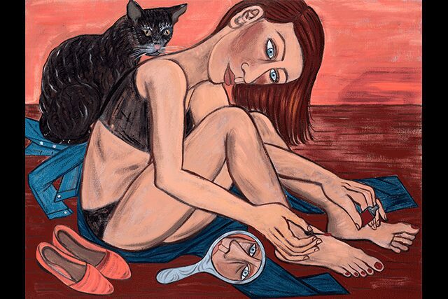Guests relaxing in the Drawing Room of the Ham Yard Hotel in London can study Cooper’s passion for nature in her Midsummer Night painting. Featuring two sleeping figures and a donkey, the allusion to Shakespeare’s play is not lost, but it is the depiction of autumnal nature and the suggestion of an active dreamworld enjoyed by the female subject that captures the imagination. Cooper thinks of it as “the end of something.”