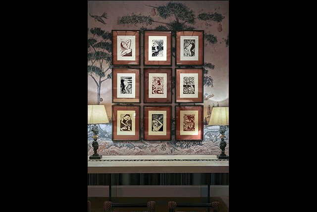 In Cooper’s linocut series called Wildwood, hung in the Whitby Hotel’s Araminta Room, the female protagonists honor Diana, the Roman goddess of hunting who turns a man into a stag, and Daphne, who transforms into a laurel tree to escape the unwanted advances of Apollo. “In mythology, those were the stories I first fell in love with,” she says.