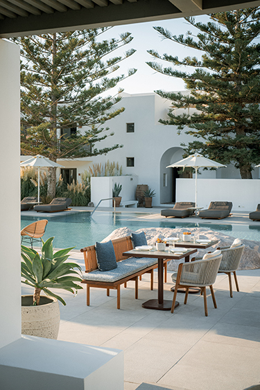 Parōn restaurant at Parīlio overlooks the hotel’s central pool