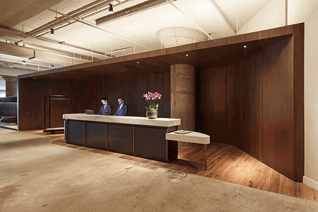 The reception area pairs the building’s original ceilings with modern details like warm wood and brass
