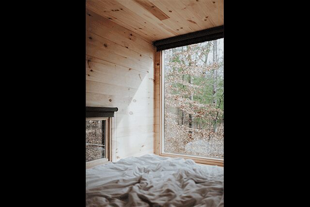 If we design well, your eye isn’t drawn to any particular detail or feature, but rather the simplicity and restraint of the cabin. This isn’t about having a creative storage solution or four-purpose nook, but rather giving you an easy escape where you don’t need to think about where anything is or how it works. That said, the design feature that we get the most comments about is our big window that is strategically placed so guests have a perfect, uninterrupted look out to the natural landscape. It has the effect of feeling like you’re entirely immersed in the outdoors while still being cozy inside.