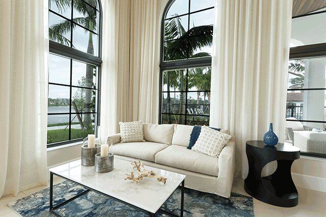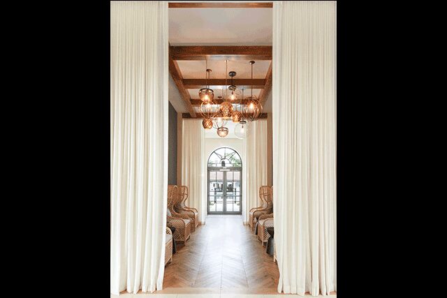 With “a lively edge to its laidback, Santa Barbara-inspired vibe,” tennis superstar Venus Williams’ design studio V Starr Interiors created a model unit, clubhouse, and amenity spaces for the luxury residences Atlantico at Alton in its backyard of Palm Beach, Florida to complement the surrounding white sand beaches, golf courses, and neighborhood feel, says vice president Sonya Haffey. “In the same way that hospitality has sourced feelings of coziness and comfort from the residential sphere with the rise of Hygge,” she says, “we found inspiration in the sense of community that is created in multifunction spaces usually found in hotels.” Colors and textures come together harmoniously in the clubhouse kitchen, where a gray and white patterned backsplash is paired with mirrors and sconces. Elsewhere, shades of gray and rich blue playfully contrast warm wood and rattan furniture. “Our design softened hard architectural elements like iron and stone with subdued shades and plush, flowing fabrics,” she adds, while subtle beachy accessories and expansive windows allow natural light to pour in, a key element that unites the spaces.