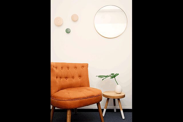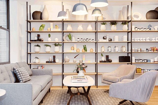 A residential, Scandinavian feel starts at the entry, where birch plywood shelves lined with Yinova’s custom herb blends and a cozy seating nook beneath a cluster of pendants greet patients. In the all-white treatment rooms, hanging bronze wall vases filled with greenery adds a textured layer.