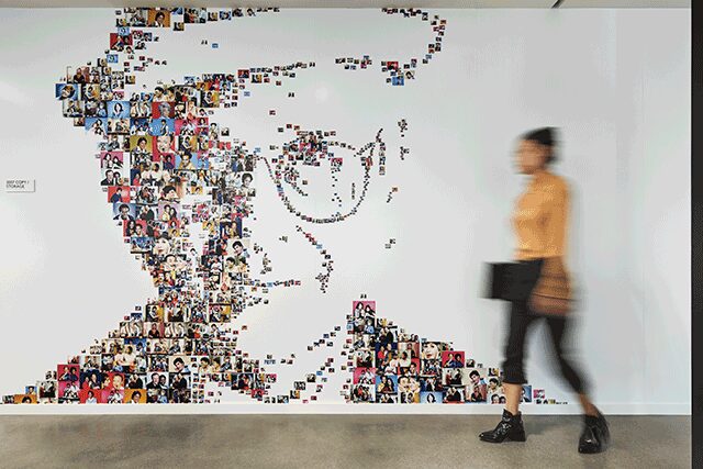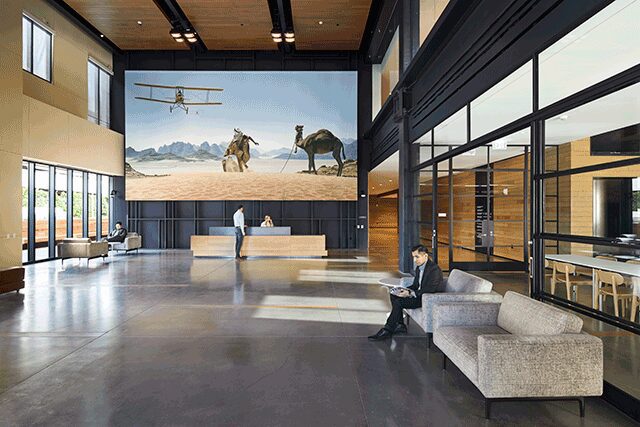 To reinterpret a landmark Art Deco building in Culver City, California from the 1920s into an inviting, community-focused office space for media powerhouse Sony Pictures Entertainment, Gensler looked to “provide adaptability for an evolving industry and foster wellness and teamwork among diverse user groups—ranging from Sony Home Entertainment to record labels,” explains principal and design director Lee Pasteris. Named for Sony cofounder Akio Morita, the building’s sustainable design takes cues from the past, creating a backlot feel with an open layout and modern sensibility, notably in the use of exposed steel, concrete floors, and wood ceilings, she says. The double-height lobby boasts a handpainted desert scene from Lawrence of Arabia above the reception desk to complement the rich material palette, while interconnecting staircases create fluidity between floors. For a direct nod to the company, a portrait of Norman Lear, the famous Hollywood TV writer and producer, made of hundreds of photos covers a wall in the Home Entertainment workplace. Meanwhile, a museum, commissary, and coffee shop are also housed on the ground floor, where folding rolled steel and glass doors open to the outside, forming a shared gathering space for employees to take in the California sunshine.