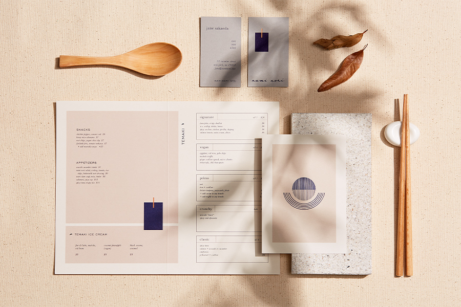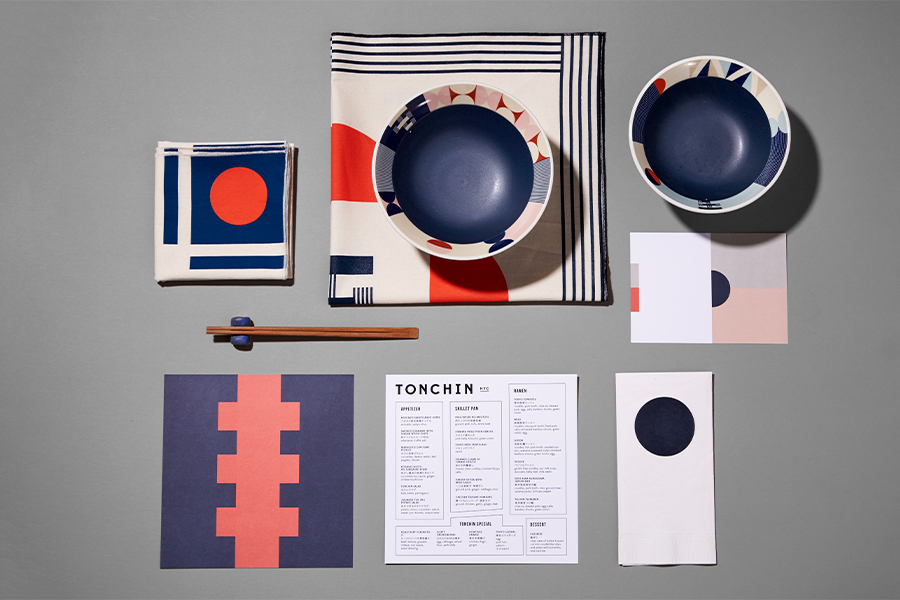 Enter LMNOP. One of her first clients was the Smith restaurant in New York, which opened the door to a longterm collaboration with Morgans Hotel Group. But it was her firm’s work on Tonchin, a Japanese ramen brand that was making its debut in the U.S., that proved pivotal. Tasked with adapting the heritage brand for a new audience, Nelson introduced bold, geometric graphics and patterns that form endless combinations on menus, handmade ramen bowls, and the scarves worn by servers.