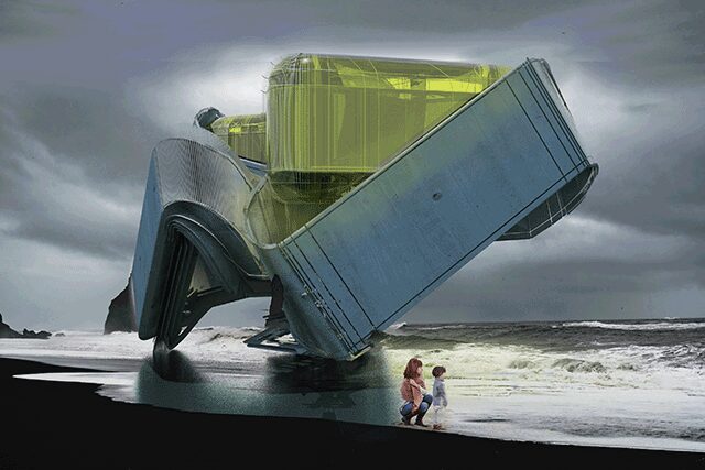 Located near the Louisiana coastline, the proposed Self-Excavation Hurricane House rotates to excavate the ground during storms