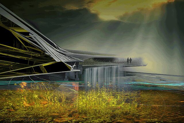 The proposed design for the Eco-Crematorium in Santa Monica is one of Margot’s most ambitious projects yet. Designed as an open outdoor event space, the concept’s parabolic reflectors surround the crematorium chamber and can be angled to obtain the strongest solar concentration to cremate a body. The garden of remembrance wraps around the crematorium and is made from undulating sections of rubber embedded with LED lights to create the landscape, while lighting equipment projects holographs and caters to the ceremonial event of cremation. Ashes can take on multiple roles, whether added to a firework as part of an illuminated display or to concrete to form an ocean reef. In addition, a magnet will collect metals from the ashes, which are then recycled and reused for aircrafts and cars. “Death is a part of life [and is] sometimes overlooked in architecture,” she says. “As technology evolves, it has given us options outside of the general rituals [we have come to know].”