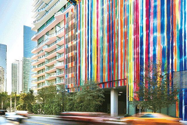 Approaching the SLS Brickell Hotel & Residences in Miami, passersby are greeted by a large-scale installation of painted stripes. That’s all thanks to artist Markus Linnenbrink, who reimagined an otherwise ordinary concrete façade into a vivid canvas that showcases one of his signature drip paintings in large scale.