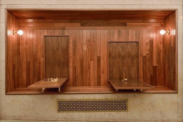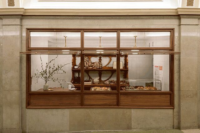 Arcade occupies the lobby of the Merchant’s Square building in New York’s Tribeca neighborhood. To accommodate the slanted floor, Workstead designed the bakery as a series of alcoves, each with a distinct purpose. Rich mahogany millwork and paneling unite the separate spaces, including the clever and unexpected fold-down tables that “complement the rich, warm aesthetic of the space’s architectural bones,” says Highsmith.