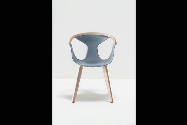 Pedrali’s Fox armchair boasts a thin fiberglass reinforced polypropylene shell with a curved ash profile.