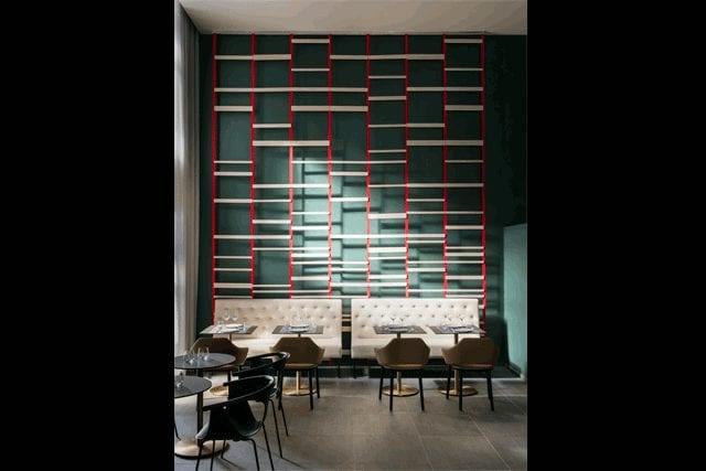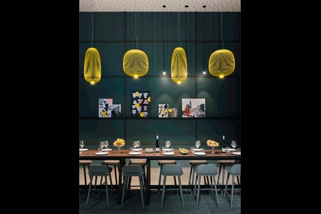 Along with helping to conceptualize Okko Hotels in 2008—including its brand identity—he also designed all eight of the currently open French 4-Star properties, which retain his signature pops of color. “I don’t have a predefined aesthetic,” he says, but “thanks to color in particular, I can express my intentions and emotions, which helps plunge the user into the defined narrative.” For instance, lime green seating populates an outdoor lounge at the Bayonne property, while bright yellow light fixtures suspend above a dining table in Strasbourg.