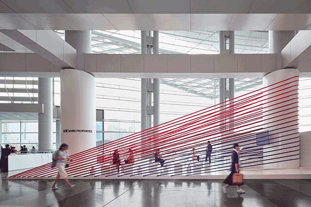 Another example is Spectrum. Designed for Art Basel Hong Kong in 2019, the 3D-like installation in Swire Properties’ VIP lounge looked effortless, yet “simplicity was achieved with a complex engineering structure,” he says. The ombré bands of red and blue fabric create a visual rhythm, drawing the eye upward to the stage.