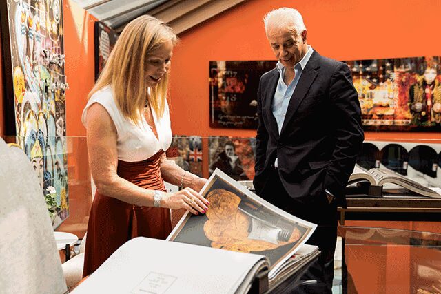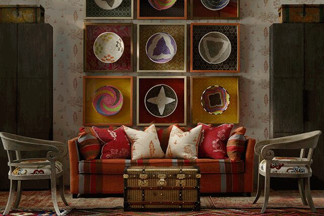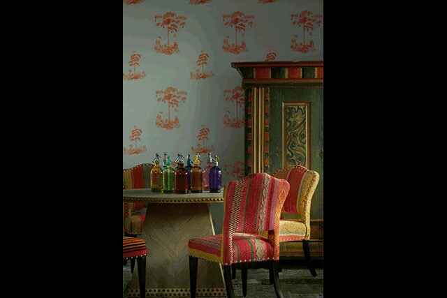 Before Kit Kemp won the coveted Andrew Martin Interior Designer of the Year Award in 2008, she was an admirer of the eclectic and intrepid global design brand, established in London in 1978. Like her, the emporium’s founder, Martin Waller, is an original thinker. As friends and mutual supporters, they’ve waited for the right opportunity to work together, finally joining forces in 2018 on a range of fabrics and wallpapers for the Kit Kemp for Andrew Martin collection (available through Kravet in the U.S.). Reunited in the brand’s Walton Street showroom, the duo talked about design originality, celebrity, color, and collaboration.