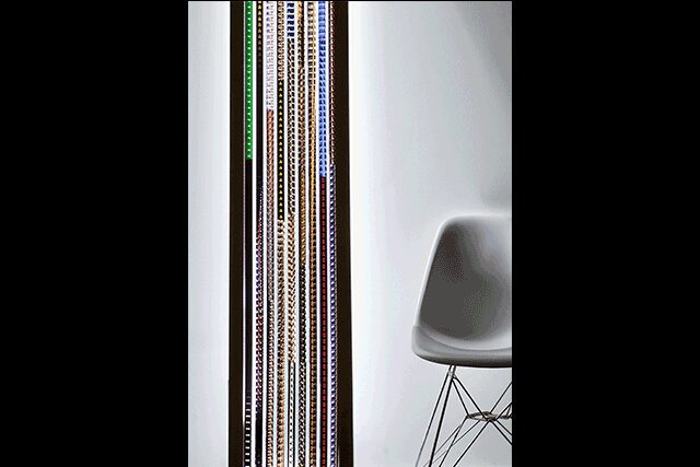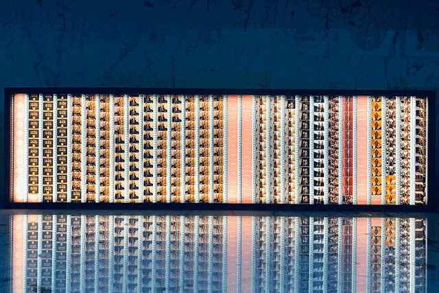 When his grandparents passed away shortly before he graduated college in 2000, he inherited their old film prints, more than 3,000 of them, in fact. Looking to combine his graphic design background with his love for cinema, he started crafting framed light-boxes and turning them into art pieces with the edited film reels from his collection. “I always liked photography and always was a designer, so this was a great hybrid for me,” he says.