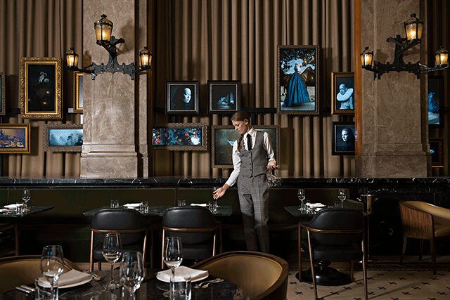 In many ways, the Duchess in Amsterdam is not only a departure for Entourage Group but perhaps the jewel in its crown. A sprawling Michelin-starred fine dining restaurant in a historic former bank, it speaks more to traditional grandeur than slick modernism. Located in the main hall of the building, stained glass windows adorn the ceiling, where chandeliers hang canopy-like above diners. Contemporary flourishes, including LCD screens in ornate frames that display a mix of static and video artwork to a metal origami back bar designed by Tel Aviv-based artist Ilan Garibi, seamlessly integrate into the design.