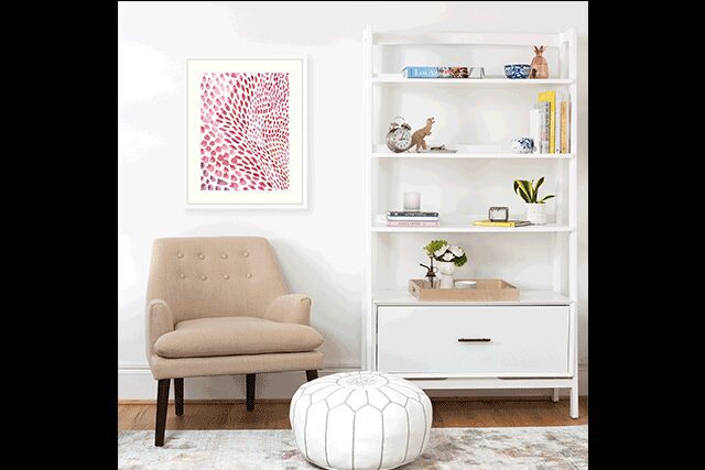 Street Cred: Christine Joy Llewellyn’s aesthetic is marked by lighthearted hand-drawn motifs and rhythmic, minimalist patterns that are “simple, elegant, graphic, and bold,” she says. The New York native started off in finance before shifting her focus to surface pattern design, which is influenced by her Caribbean heritage, growing up in Queens, and living in central Africa as a young girl. She works in many different mediums, including ink and marker, but “my absolute favorite is watercolor,” she says. With Pink Dots, the harmonious blend of supple blush and red tones react in dynamic ways. “I love that you are forced to relinquish control and be flexible,” Llewellyn remarks. “It’s magical to watch the water, paint, and paper interact simultaneously.”