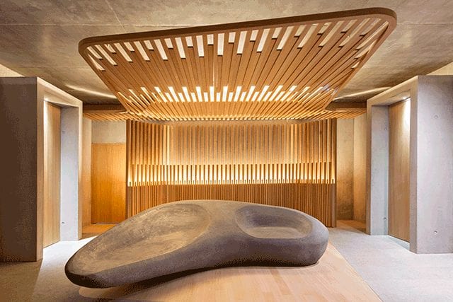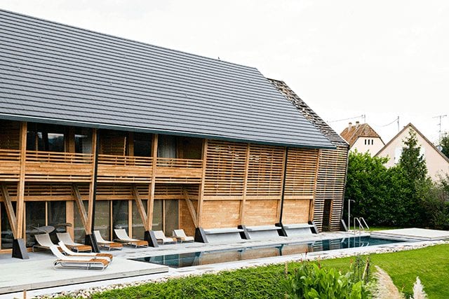 At Hotel des Berges’ new modern barn-inspired Spa des Saules annex, timber-slatted balconies overlook the pool.