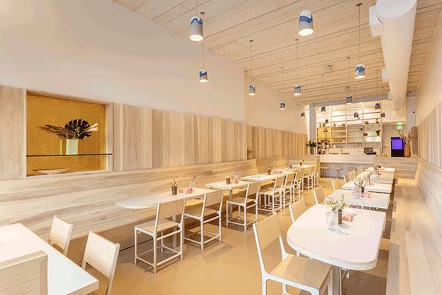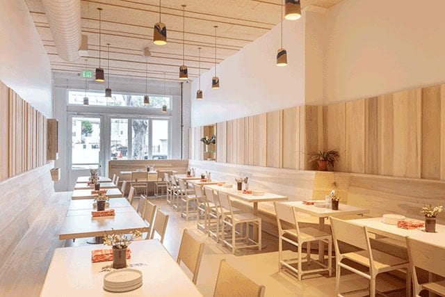 Hymanson, a Chicago native, was always into food, cooking since she was a young child, while Kramer, a former Broadway performer (she starred in Mamma Mia! when she 17), always had an interest in the quality of the food she was eating. Despite these backgrounds—or because of them—the chefs made a bold decision in 2013: They moved to Los Angeles to open a falafel shop and a restaurant without any funding or partners. That dream became a reality when local chefs and restaurateurs Jon Shook and Vinny Dotolo of Animal, Son of a Gun, and Jon & Vinny’s stepped in to help them launch Madcapra, a falafel counter in Grand Central Park in 2015, and more recently, the Middle Eastern-inspired Kismet in Los Feliz, which debuted this past January. Thanks to local designer Jeff Guga, the latter is dressed in blond wood and natural light with a minimalistic aesthetic that draws on Kramer and Hymanson’s ambitious menu of reinvented Middle Eastern fare rooted in its California locale.