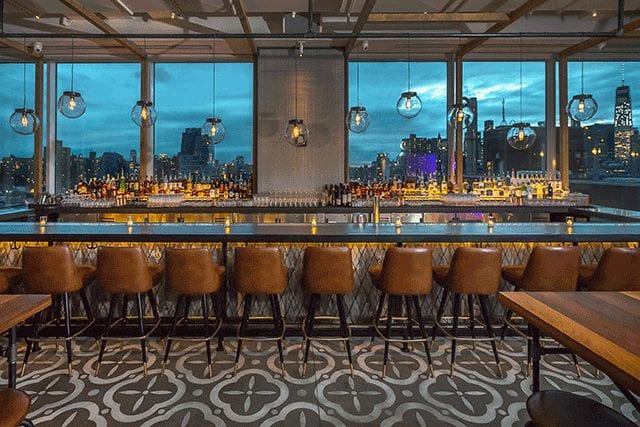 Collaborating with Brooklyn firm Crème, Mr. Purple’s stellar views of the New York City skyline enhance the Lower East Side-inspired design of cement floors, timber beams, and street art.