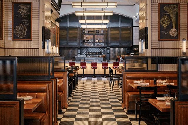 The Roman and Williams-designed Kingside, located in the Viceroy New York, embraces a casual interior with a black and white graphic palette juxtaposing caramel leather banquettes and rich red barstools.