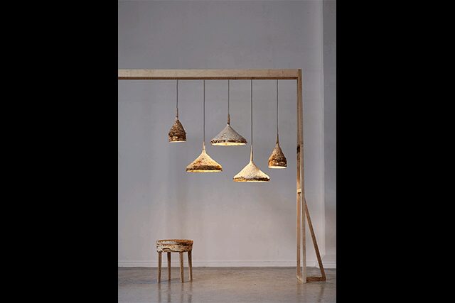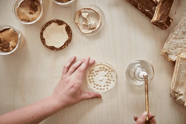 Recently, the studio has been experimenting with mycelium, primarily in lighting. Just as sustainable as wood, the fully biodegradable, vegetative body of fungi contains threads known as hyphae. Cox was inspired, naturally, by something in his woodland surroundings. “I saw two rods of hazel that appeared to be bound together by a fungus. The branches were fused very tightly and that made me think of the way in which we bind small pieces of wood together in the workshop,” he says. “We’re not entirely comfortable with the use of resins or concrete to bind wood together, and this seemed like a wonderful, natural alternative.” That said, the fungus offers its own obstacles, as it cannot be manipulated into the exact forms a designer might want. But Cox enjoys the challenge.