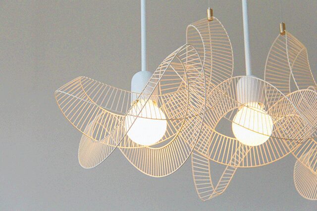 Metal, glass, and ceramic are materials of choice, with the studio’s first series employing fan cages once used for livestock that were then cut, bent, and painted. “Our pieces are simply a composition of some of the most beautiful coincidences of the industrial world,” he explains. Recently, his fixtures have been displayed at fashion brand C’est Beau’s first retail space in Montreal (conceived by local design studio Obeikt), while Humm, donning swirling black and brass detailing, can be found in the city’s Pastel Rita café.