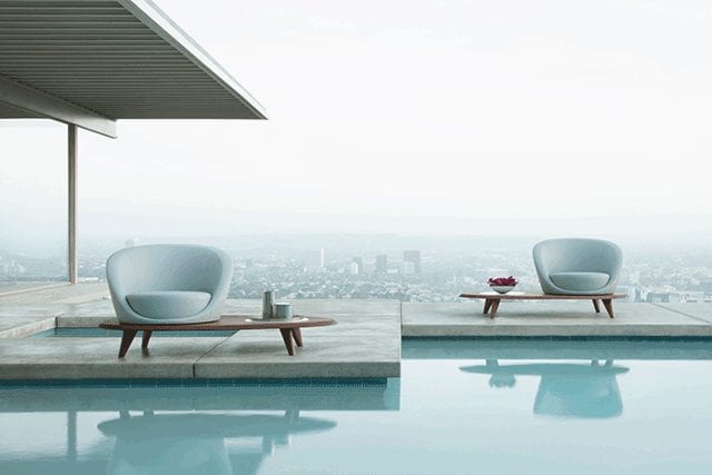 The series of tables and chairs is a take on what one might find in a modern Egyptian palace. “We took a big story and stripped it down to its essence; we wanted nothing extraneous,” he says. “I’m excited by the effort that goes into making things simple.” The sleek Ibis sofa, for example, recalls the outstretched wings of the sacred bird, while the Float table and Aire bench mimic smooth rocks and pebbles along the shore of the Nile. The Lilypad, a unique table with a swivel chair rising from the top like the floating flower after which it is named, evokes both strength and serenity. The Egyptian sky god Horus was often depicted in ancient art sitting on a water lily, so “when you sit on it, you’re subconsciously a god,” says Crews.