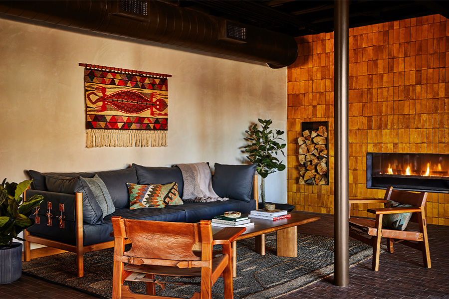 A lobby seating area at Trailborn Grand Canyon, designed in collaboration with Lake Flato