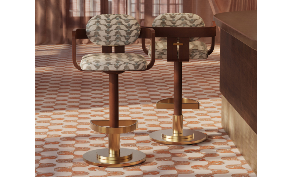 The Freda barstool from StyleNations combines a sculptural solid ash wood frame with a range of customizable stain options. Finished in a brass EPD powdercoat, the round stainless-steel base and footrest deliver durability and refinement.
