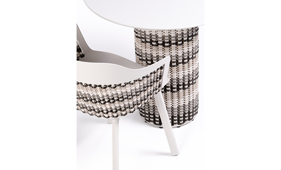 Designed by GamFratesi, the MYMI outdoor dining collection for Dedon features woven chair backs and table bases that are made with teak or powdercoated aluminum. Two seat hues, four weaving colorways, and two table styles are also available.
