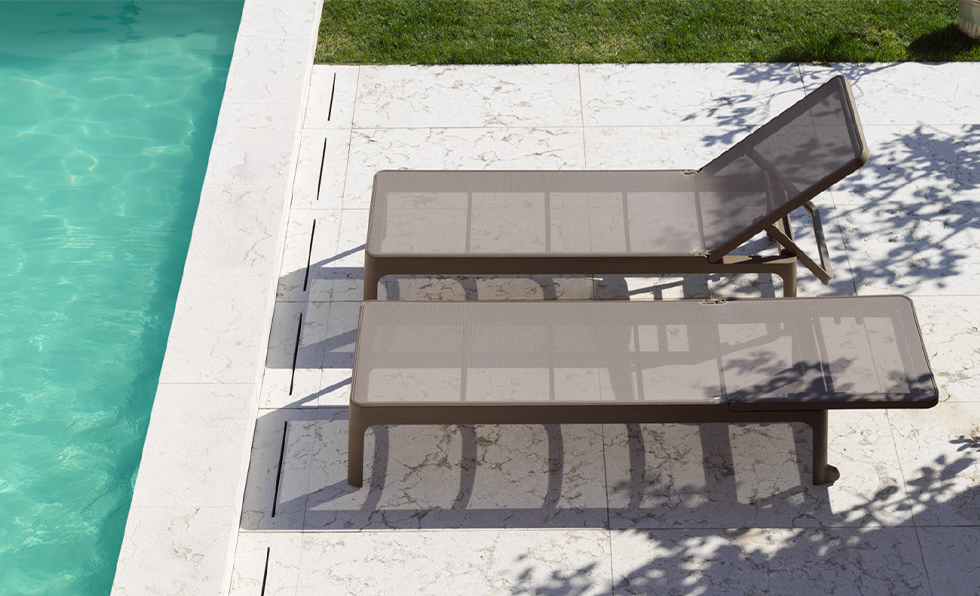 Available in five colorways, Nardi Outdoor’s Plano sun lounger has a wide surface, patented four-position backrest, and the ability to lay flat. Built-in wheels, non-slip feet, and a folding system for stacking provide convenience and ease of mobility.