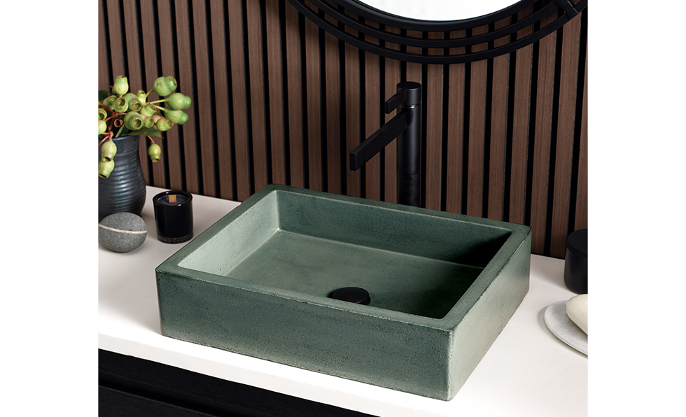Native Trails expands its NativeStone collection with four earthy finishes, including Sand, Forest (shown), Terracotta, and Sage. The eco-friendly concrete sinks and tubs offer rich natural hues in a lightweight and sustainable form.