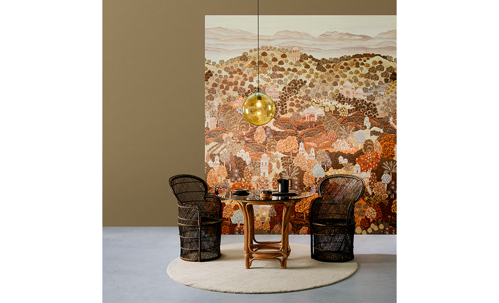 Arte debuts a trio of new wallcoverings that fuse classic influences with a contemporary spirit, including Sundara (shown), a Rajasthan-inspired panorama on glossy fil-à-fil.