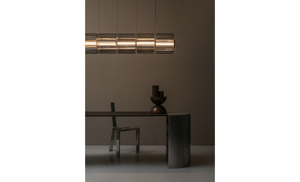 Designed by Lukas Peet, the Column 175 pendant by A-N-D showcases a minimalist glass column with aluminum accents that allude to the fluting of columns on buildings. The lightweight yet durable fixture can be used alone or as part of a cluster.