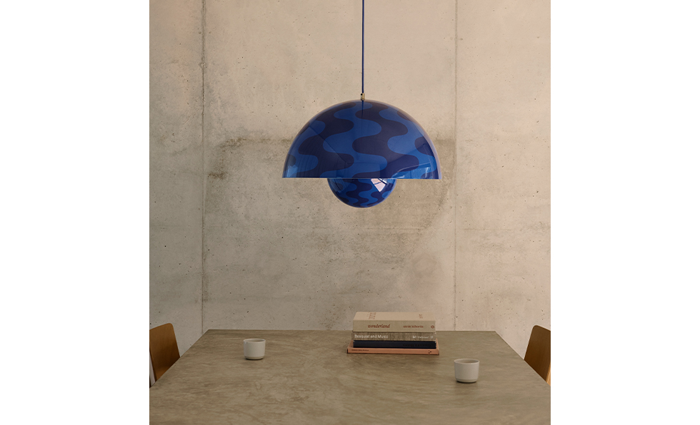 The &Tradition VP2 Flowerpot lamp, designed by Verner Panton in the 1960s, is a Danish design icon. Available through Ameico, it is now comes in five colorways, including cobalt blue in the twilight wave pattern (shown).
