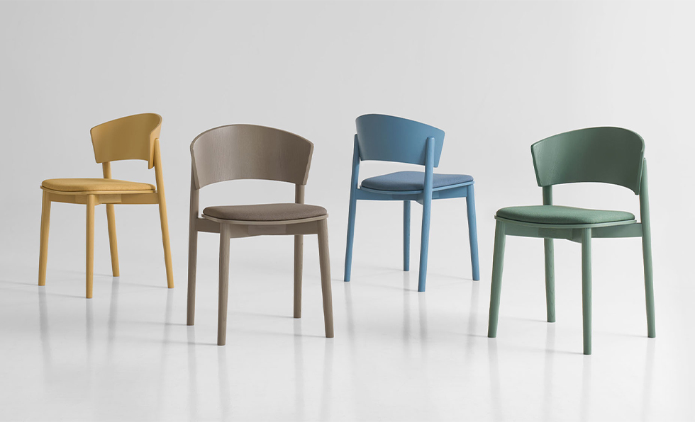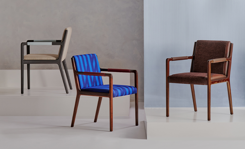 Balancing elegance with ergonomics details and soft curves, the Hazel chair from HBF is constructed from a solid ash frame and features refined upholstery details that come in single, dual, or multi-fabric options.