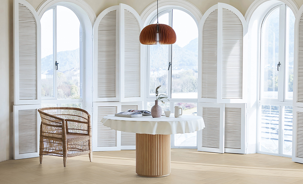 Shown in a herringbone pattern in European Oak with a light-wire brushed texture, the hardwood collections from Eko Flooring & Woodwork are organic, eco-friendly, and sustainable.