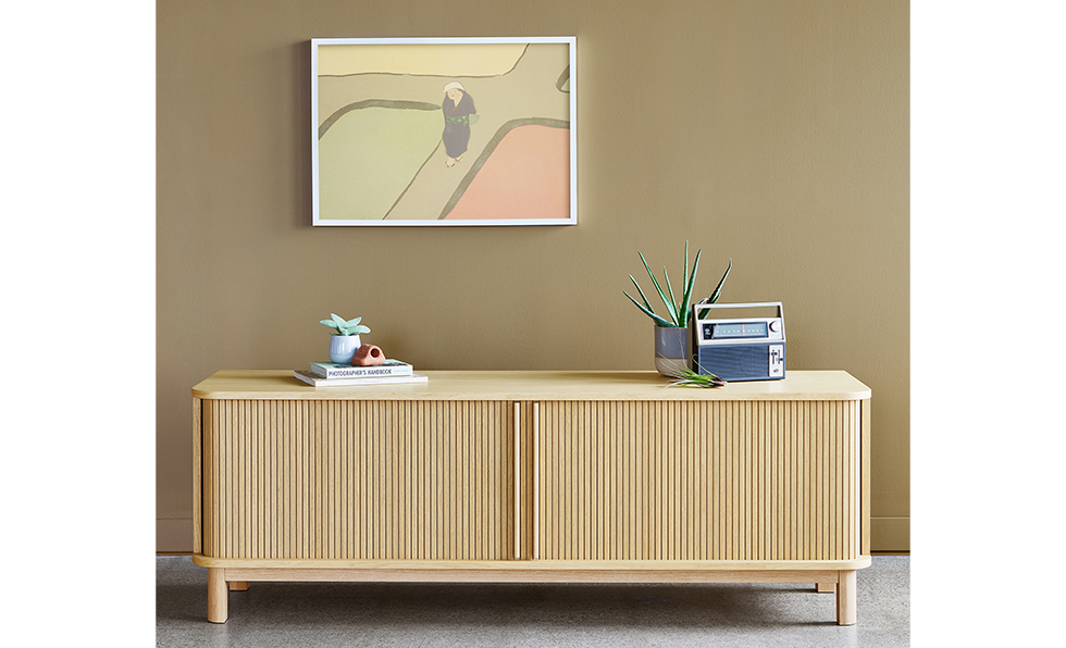 Ledger from Gus* Design Group features tambour wood sliding doors, FSC-certified materials, and zero VOC finishes. Wrapped in vintage oak, the credenza offers two storage compartments, wire management, and a water-resistant finish.
