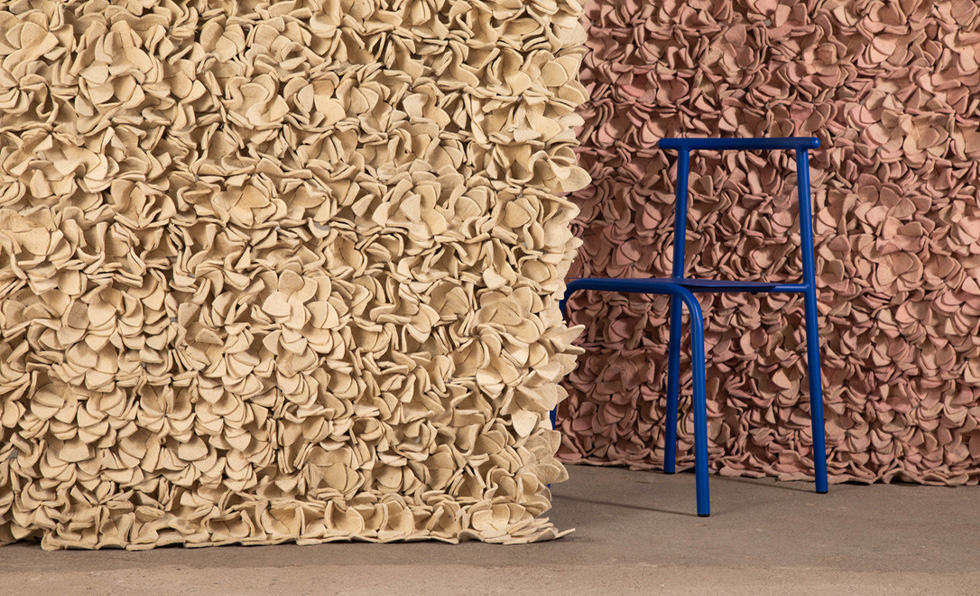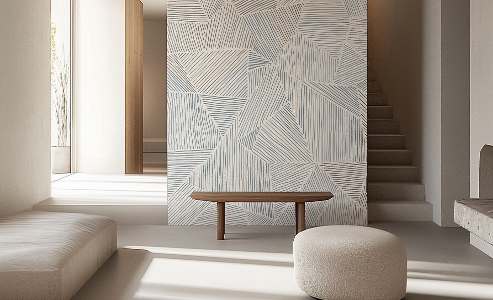 Drawing from the layered textures and the geometric forms of origami, Tokyo by Jill Malek is a large-scale, non-repeating pattern digitally printed on Type II commercial-grade, nonwoven material, with optional handsewn felt accents.