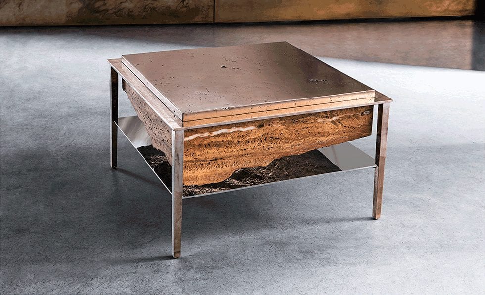 Gianluca Pacchioni found inspiration for his Cremino collection of tables in pieces left to rust and patina naturally outside of his home studio in Milan. Persian red travertine is partially covered in liquid brass, which conforms to the surface’s cavities and craters.